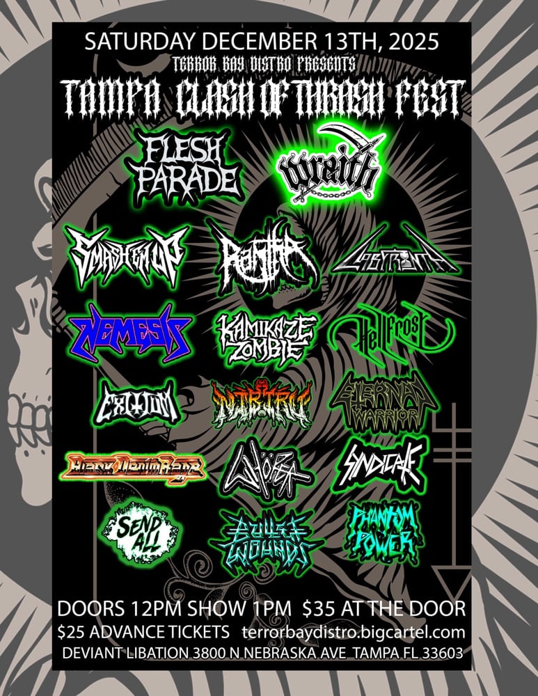 TAMPA 1st CLASH OF THRASH FEST! THRASH AND CRAZY BANDS FROM ALL OVER THE STATES 15 BANDS IN TOTAL, 2 STAGES, VENDORS, FOOD TRUCKS AND MORE!!! A FULL DAY OF CIRCLE PITS AND HEADBANGING FUN!! ALL AGES! DOORS 1pm FIRST BAND ON AT 2pm! TICKETS ONLY $25! THEY WILL GO UP AFTER THE FULL LINEUP IS ANNOUNCED!! $30 AT THE DOOR!FULL LINEUP:NEMESIS-(NC SPEED THRASH CHAOS!)SMASH’EM UP-(TAMPA BAY THRASH!)PHANTOM POWER-(ELECTRIC PUNK THRASH!)EXITIUM-(HOUSTON TX THRASH!)KAMIKAZE ZOMBIE-(NOLA DEATH/THRASH)WHORER- (TAMPA)SYNDICATE-(TAMPA)RAMTHA-(TAMPA)SEND ALL- (ST. PETE/TAMPA)NIBIRU-(GAINESVILLE)LABYRINTH-(HOUSTON TX THRASH!)HELLFROST-(SWFL DARKEN THRASH!)ETERNAL WARRIOR- (SOUTH FL PARTY THRASH!)BLACK DENIM RAGE- (SFL SPEED STREET THRASH)BULLET WOUNDS-(TAMPA THRASH)WRAITH- (IN DARK HEAVY STREET THRASH)AT Deviant Libation3800 N. NEBRASKA AVE. TAMPA FL.ALL TICKET SALES ARE FINAL NO REFUNDS UNLESS SHOW IS CANCELLED. LINEUP IS ALSO SUBJECT TO CHANGE. ALSO THERE ARE NO PHYSICAL TICKETS YOUR NAME WILL BE PUT ON A WILL CALL LIST PLESE SHOW ID AT THE DOOR TO GET YOUR WRISTBAND.